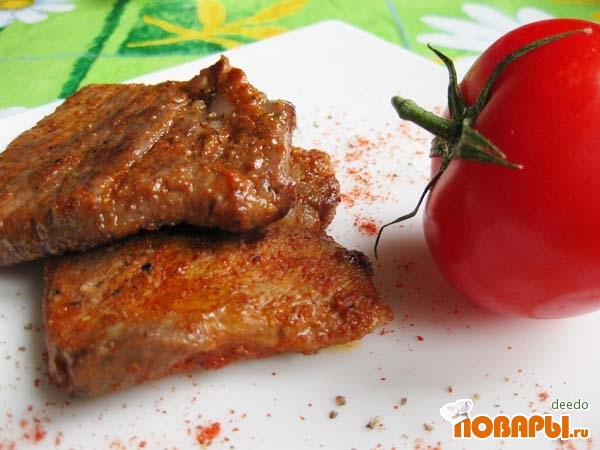 Разогреть сковороду и довольно быстро обжарить мясо в разогретом масле без крышки на среднем огне (у меня ушло минут 10, переворачивала раза 4-5)