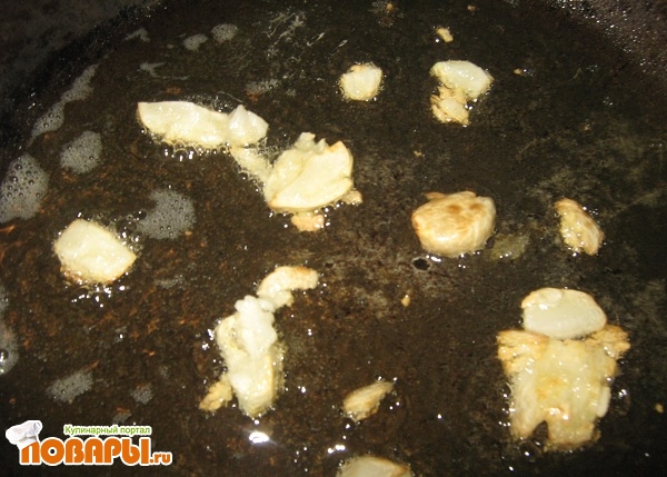 Кладем чеснок, обжариваем. Как только стал золотистого цвета, добавляем лук, обжариваем до придания луку прозрачности.