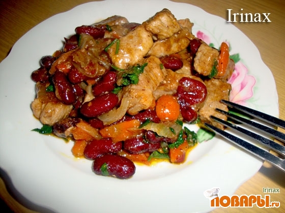 Добавить к луку с морковью мясо и жарить, пока мясо не станет коричневым,затем посолить и приправить. Закрыть крышкой и дать мясу приготовится, изредка помешивая. За 10 минут до готовности всыпать фасоль в томатном соку и дать потушиться 10 минут.