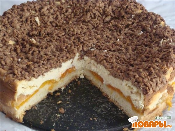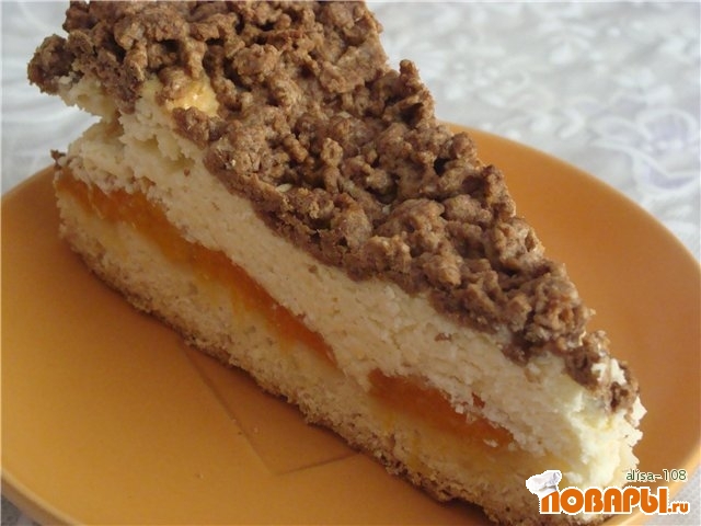 Достаем тесто из морозиловки. Белую часть раскатываем по форме. Выкладываем абрикосы, слегка присыпаем их сахаром, сверху выкладываем сырную массу. Шоколадное тесто натираем на крупной терке сверху творожной массы. Отправляем выпекаться в духовку. Температура духовки 180 градусов. Форма для выпекания 26 см.