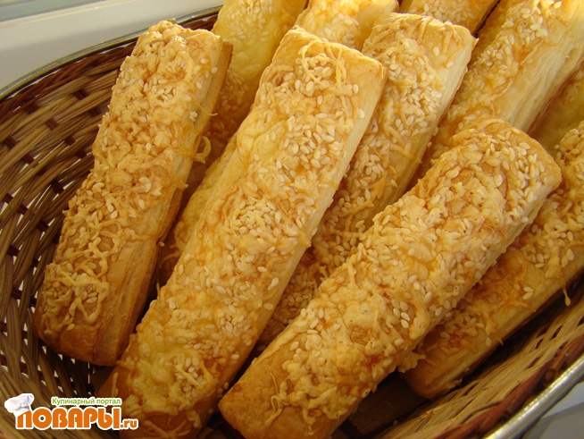 Раскатать тесто до 3 мм (стандартное тесто, купленное в супермаркете идет двойное, а нам понадобиться чуточку потоньше). Порезать ломтиками тесто (приблизительно 10 на 3). На каждый ломтик теста посыпать тертым сыром и кунжутом сверху в одинаковых пропорциях.