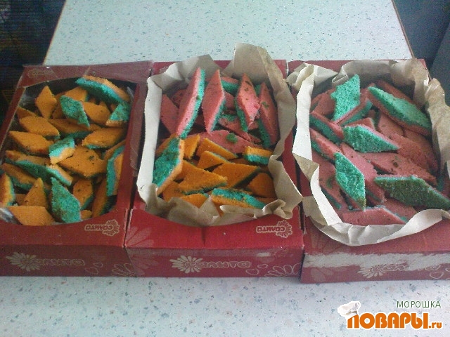 Противень смазать маслом.Одну часть теста вылить на противень,а вторую часть уже аккуратно выкладывать ложкой поверх первого слоя,чтоб не перемешать цветные слоИ.