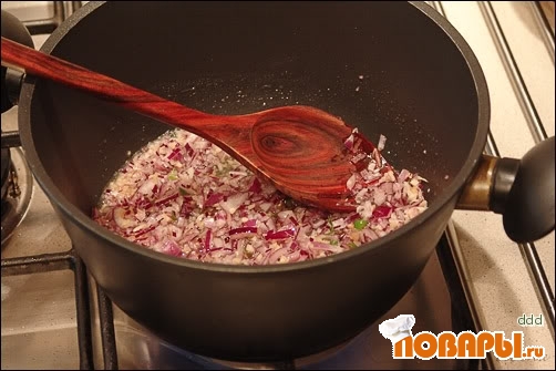 В разогретое масло бросаем лук, чеснок, 4 перчика и галангал. Обжариваем на среднем огне минут 5-7.