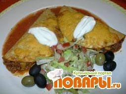 Продолжаем готовить на небольшом огне в течение 10-15 минут. Раскладываем мясную смесь на лепешки. К столу подаем такос посыпанные натертым сыром, сметаной, помидорами и салатом.