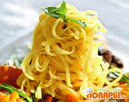 Приготовить спагетти. просеять на рабочую поверхность муку с солью так, чтобы получилась горка. Яйца и желтки соединить в миске. Сделать в мучной горке достаточно глубокую и широкую ямку и влить в нее яйца. Начать замешивать тесто, подсыпая муку в яйца с "периферии" горки.