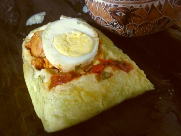 Брать кусок бананового листа(или любого из вышеуказанных), ложить на него хорошую столовую ложку рисовой массы, по серединке делая ложкой углубление, в него ложечку томатной поджарки, на все это 2 кусочка мяса, а сверху кружочек яйца.