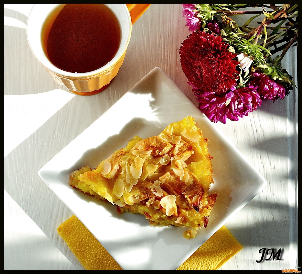 Сверху выкладываем нарезанные тонкими ломтиками яблоки. Заливаем хорошо взбитым сладким соусом