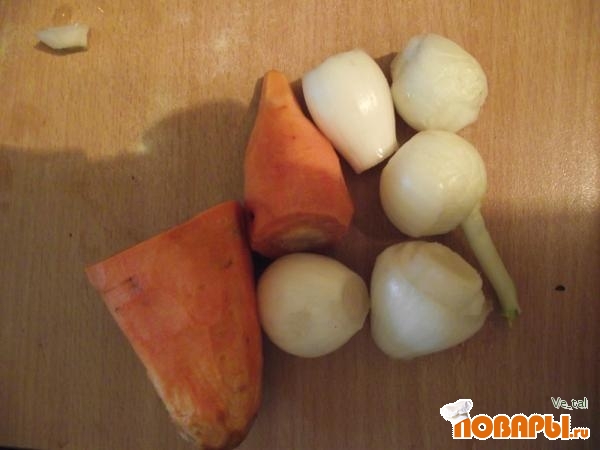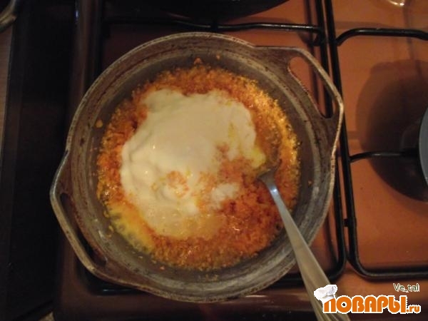 Для этого обжарим в отдельной посуде измельченные лук и морковь, затем добавим сметану,муку, соль, перец и помешивая потушим около 10 минут,