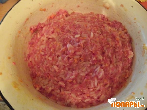 В уже готовый фарш (кстати фарш можно взять любой) добавляем отваренный остывший рис, измельченную морковь с луком, яйцо, соль и перец