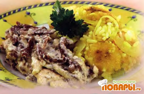 Мясо нарежьте соломкой, соедините с мелко рубленным луком (2 головки), посолите, поперчите, посыпьте мукой и обжаривайте на топленом масле 4 минуты. Затем мясо уберите, на сковороду налейте коньяк и сливки, проварите 3 минуты, посолите, поперчите, положите мясо и прогрейте.