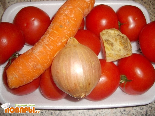 Режем крупными кубиками лук и пассеруем его в растительном масле, добавляем все по очередности, нарезка - крупными кубиками: морковь, сельдерей, стрелки чеснока, помидоры.