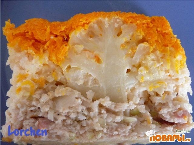 На дно формы выкладываем морковную массу. В нее вставляем соцветия цветной капусты. Затем рисовую массу, а потом мясную.