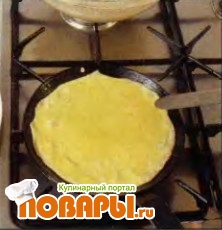 Поворачивайте сковородку, чтобы тесто равномерно распределилось по дну. Выпекайте блин приблизительно 10 секунд с одной стороны, а затем переверните лопаткой на другую.