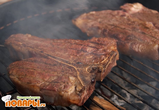 Барбекю должно закрываться крышкой.Разжигаем древесный уголь,дрова желательно от фруктовых деревьев и не желательно хвойные.После того как прогорит,выравниваем уголь,выкладываем стейк,закрываем крышку и ждем 20 мин.после переворачиваем стейк и ждем еще 10-15 мин.Стек получится сочный,мягкий и ароматный.