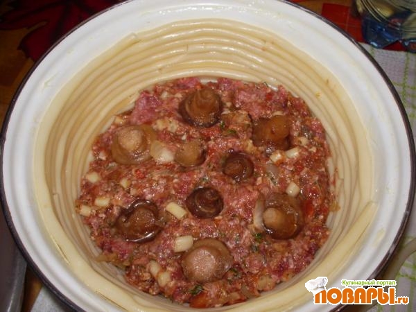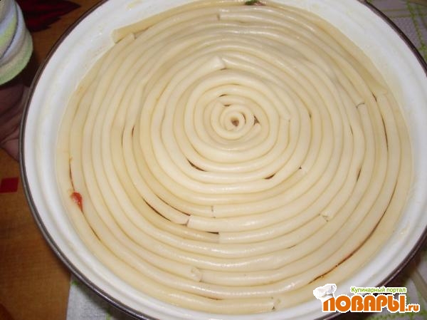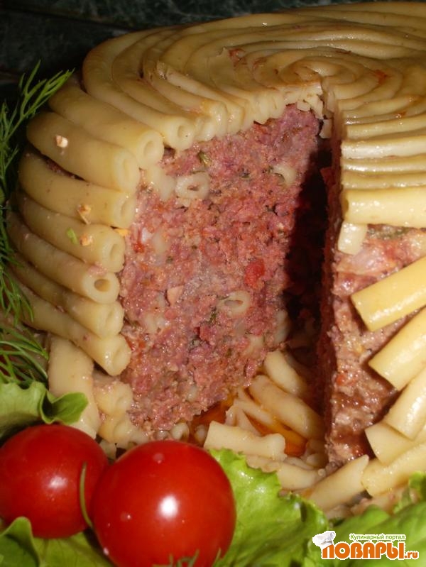 Кладем в форму начинку, приминаем ее, утопляем целые шампиньончики .Сверху делаем крышечку из макарон. Также спиралькой накручиваем наши макарончики :)