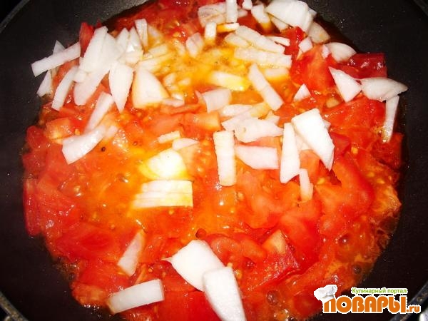 Помидоры обдать кипятком и очистить от кожицы, порезать и обжарить на оливковом масле на разогретой сковороде. Добавить лук, еще чуть обжарить.
