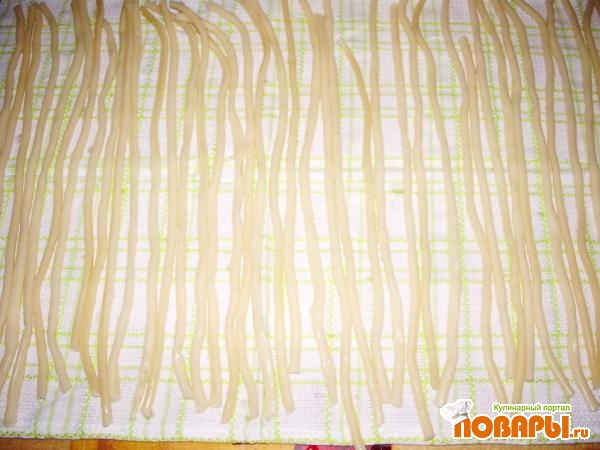 Слить с макарон воду, промыть и выложить их на полотенце, чтоб подсохли и приобрели липкость.