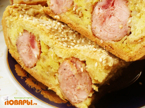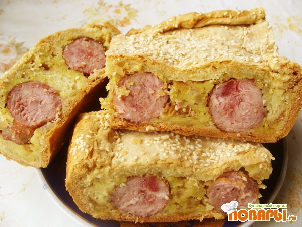 Из оставшегося 2/3 теста сформовать дно и бортики будущего пирога. Выложить колбаски и залить их приготовленной начинкой. Сверху установить крышечку от пирога, аккуратно слепить края верхнего круга и бортик.