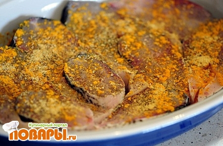 Уложить в посуду для духовки. Посолить поперчить, добавить специи: черный перец, карри, горчицу.
