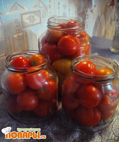 Маленькие твердые томаты разложить в стерилизованные баночки.