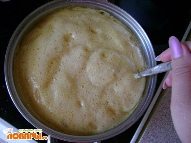 На огонь поставить мёд и постоянно помешивать. Когда мед закипит, добавить соду. Поднимется высокая пена, тщательно мешать
