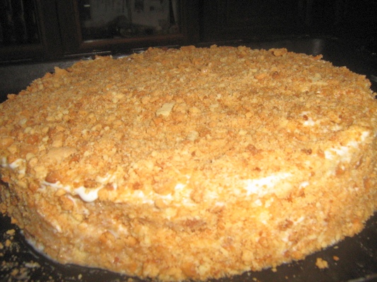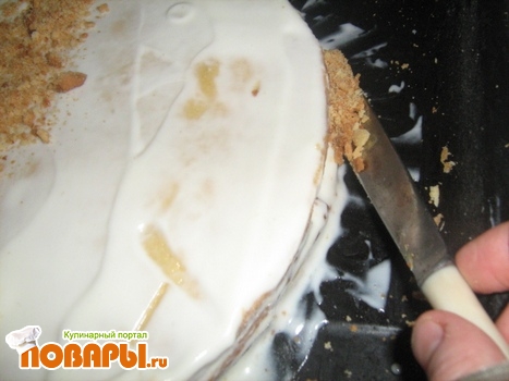 Может так статься, что коржи не удались и раскрошились, и бока не ровные, тогда в крошки можно подмешать панировочные сухари, смешать со сметаной, и просто зашпаклевать все огрехи.