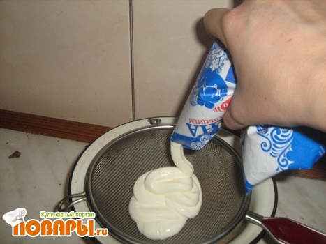Делим его на 4 части и отправляем в холодильник минут на 20. Тем временем разогреваем духовку до 220-240 град (если термометра нет, то это где-то на тройке). Заодно отцеживаем сметану, я беру любой жирности, просто выливаю ее в частое сито;