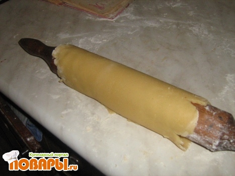 Начинаем раскатывать коржи. Тесто из холодильника вынимаем поочередно. Если при раскатке тесто рвется – добавьте муку. Раскатали корж, посыпали мукой, намотали на скалку,