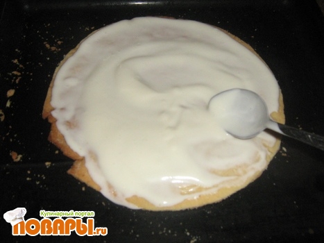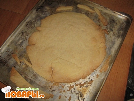 раскатали на противень. Если тесто порвалось – ничего страшного, просто склейте его. Эстетика нам не важна. Корж выпекаем в духовке где-то 5-7 минут. Как только низ зарумянился - можно вынимать.