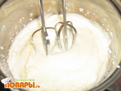 Пока коржи пекутся займемся кремом. Эту густую сметанку которая у нас получилась взбиваем со стаканом сахара.