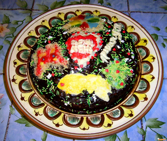 Этот торт я придумала сама. Он ассоциируется с весенними фантазиями, которые вдохновляет нам весна. Одной из граней эротики – является желание. Желание вкусно и красиво покушать, насладиться всеми гранями этой драгоценности искусства, которая называется – кулинария. Моя доля, внесённая, в эту мечту представлена Вам дорогие коллеги. Я думаю, что Вы знаете, что на вкус этот торт намного, красивее, чем на фотографии – это оценили мои малыши – это для меня самое большое счастье их положительная оценка. Золотая рыбка исполняет желания, а цветик-семицветик дополняет желание людей в простом исполнении, чтобы их мечты всегда исполнялись – это всё создаёт гармонию, дарит людям красоту, надежду, счастье и любовь.