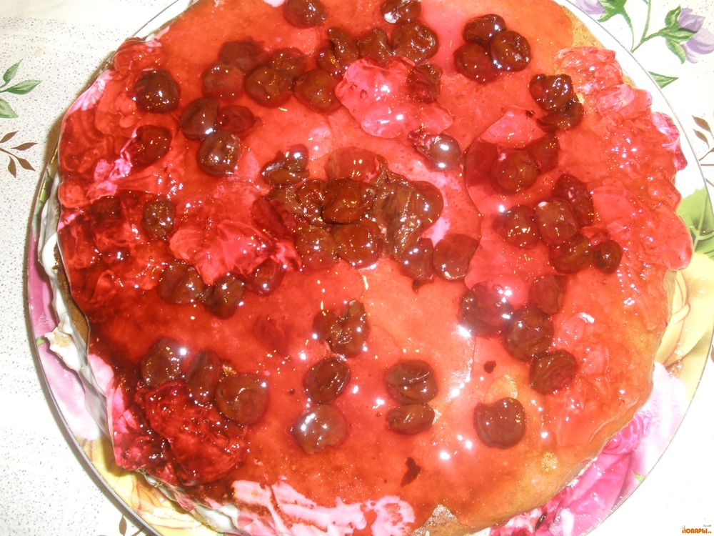 Испечёные коржи перемазать кремом. Вверх не смазывать. только бока. На вверх выложить вишни.