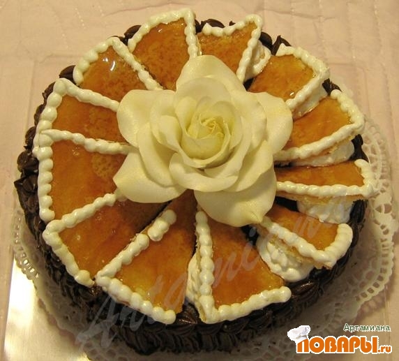 Выбрать самый удачный корж. Приготовить карамель и нанести тонким слоем на выбранный корж. Очень быстро, пока карамель не застыла, разрезать на сегменты (16... 18... 20... как удобно). Прослоить оставшиеся коржи кремом, на пятый из кондитерского шприца отсадить небольшие розеточки (или шарики) по кругу в количестве карамельных сегментов. Выложить сегменты под углом, как на картинке. Бока обсыпать бисквитной крошкой.