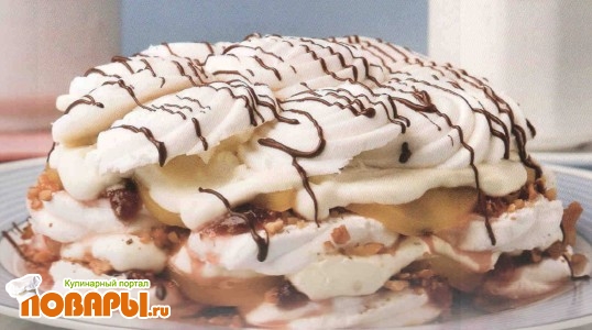 На блюдо уложите слой зефира, смажьте его вареньем, посыпьте орехами. Затем выложите слой персиков, взбитые сливки и вновь слой зефира. Слои повторите несколько раз. Полейте торт растопленным шоколадом и поставьте на 12 часов в холодильник.
