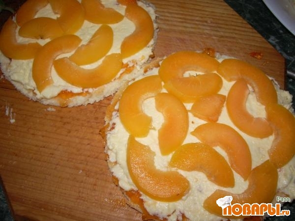 Каждый корж промазываем джемом, кремом и сверху каждого коржа кладем дольки абрикоса. Остатки коржей режем на кубики и смешиваем с остатком крема.