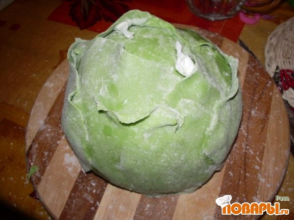 Добавляем пищевой зеленый краситель. Ну а дальше начинаем раскатывать мастику, вырезаем капустные листья и создаем кочанчик.