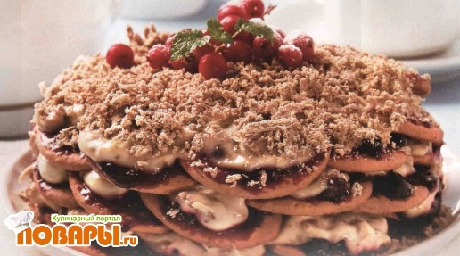 Накройте торт пищевой пленкой, выдержите в холодильнике не менее 12 часов. При подаче торт оформите халвой и черной смородиной.