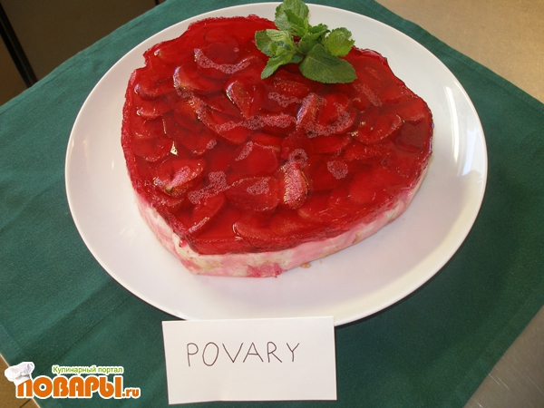 Нарезать ягоды клубники, на готовую остывшую форму выложить ягоды по принципу "рыбьей чешуи". 7 пластинок желатина растворить в 600 мл. воды, кисторчкой смазать форму с клубникой или аккуратно вылить на форму расворённый желатин равномерно распределяя кисточкой по форме.