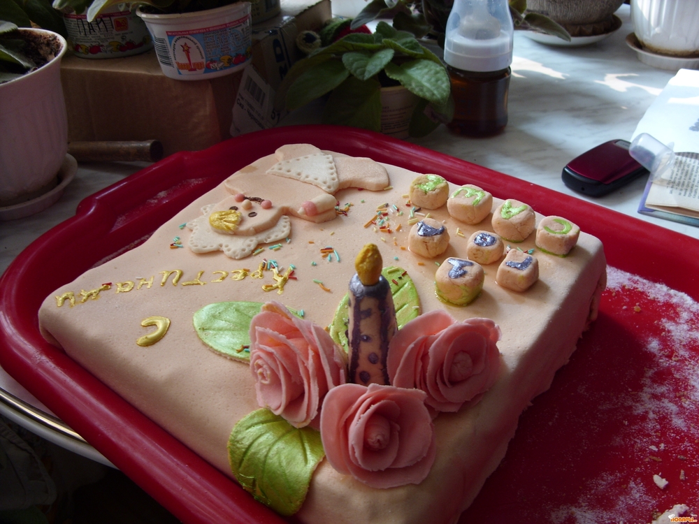 Формируем торт. Каждый корж пропитать сиропом (можно просто - вода+сахар), смазать кремом. Украсить по вкусу. Я использую мастику.