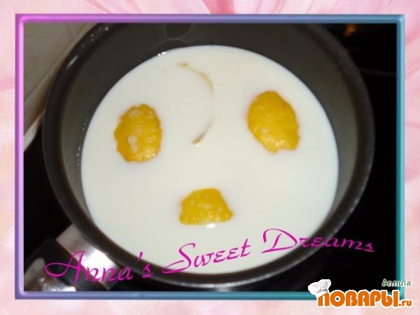 Из закипевшего молока извлекаем лимонную цедру и тонкой струйкой вливаем молоко в яичную смесь. Доводим до кипения на среднем огне, постоянно помешивая и варим еще минут 7.