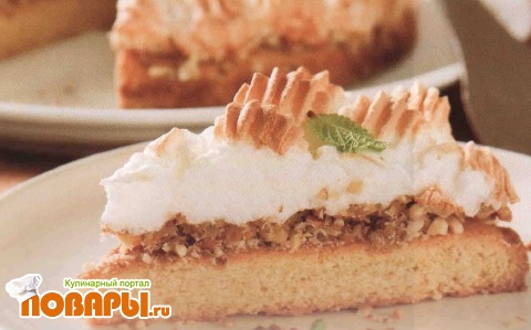 Яичные белки взбейте с сахарной пудрой в пышную массу. Тесто раскатайте в пласт и уложите в форму, смазанную маслом. Посыпьте тесто орехами, сверху выложите белковую массу.
