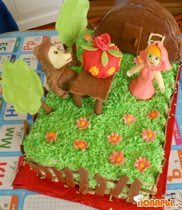Торт делала для девочки 5 лет, поэтому украсила Фигурками Маши и медведя из мастики, празднующие день рождения медведя.