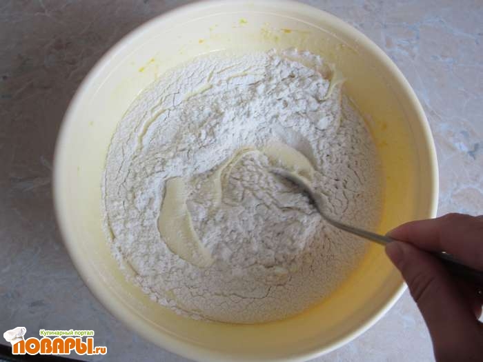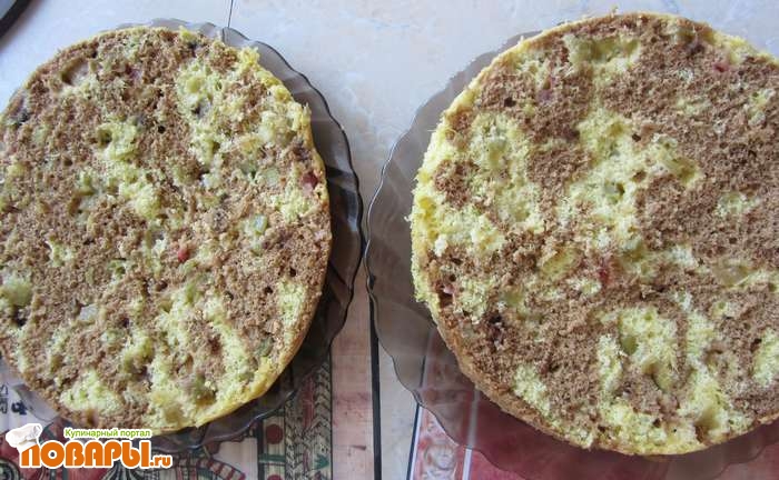 Затем заливаем все тестом другого вида и опять выкладываем начинку. Сверху заливаем все оставшимся тестом. Закрываем мультиварку, выставляем режим "выпечка" и время приготовления 65 минут.
