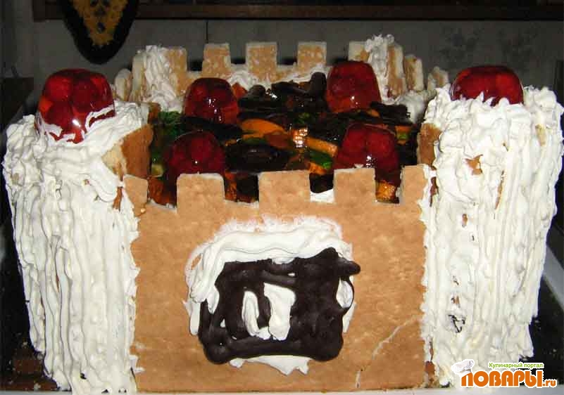 У меня получились трещинки на башнях, поэтому пришлось применить взбитые сливки для маскировки. Отломившиеся зубчики на стенках замечательно приклеиваются желатином.