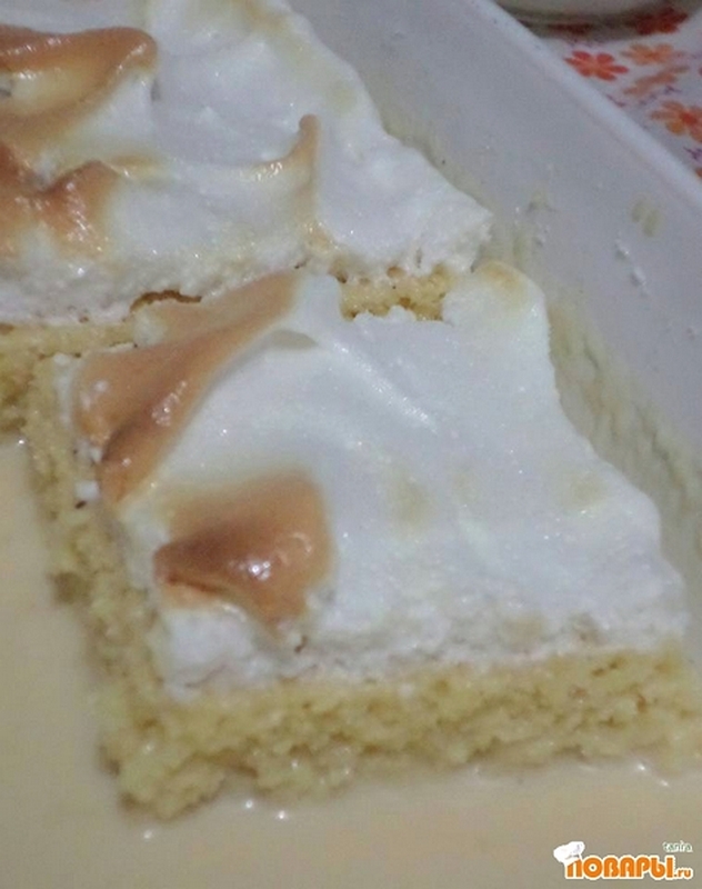 Взбить белки с сахаром, покрыть торт равномерным слоем, а затем ложкой сформировать пики. Поместить торт на несколько минут под гриль, чтобы подрумянить меренги. Если нет гриля, можно просто посыпать тертым шоколадом или украсить по вкусу. Рецепт бисквита можно использовать любой, но без жира; также можно использовать свой рецепт белкового крема для покрытия.
