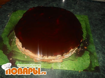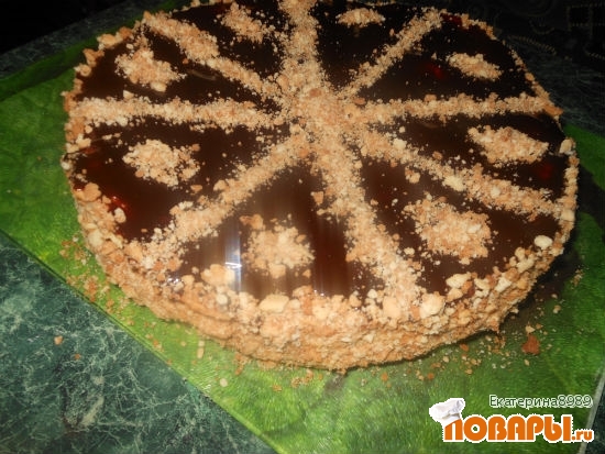 Верхний последний коржа можно полить готовой глазурью. Бока торта смазать кремом и обсыпать крошками от обрезок торта. Торт украсить как подскажет фантазия.