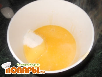 Приготовить заварной крем: Желтки взбить с сахаром, добавить к ним муку, все хорошо перемешать. Молоко довести до кипения, но не кипятить и понемногу влить к мучной массе, хорошо перемешивая все. Перелить крем в кастрюльку и варить помешивая до загустения крема.