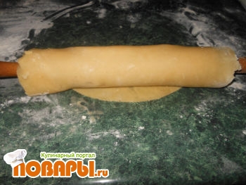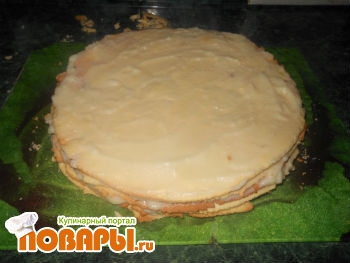 Брать немного теста и раскатать в пласт. С помощью тарелки вырезать ровный круглый корж. Корж переложить на противень, смазанный маслом и посыпанный мукой, и наколоть вилкой. Коржи перелаживать с помошью скалки.