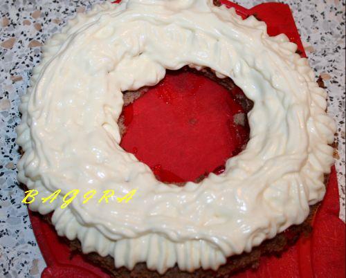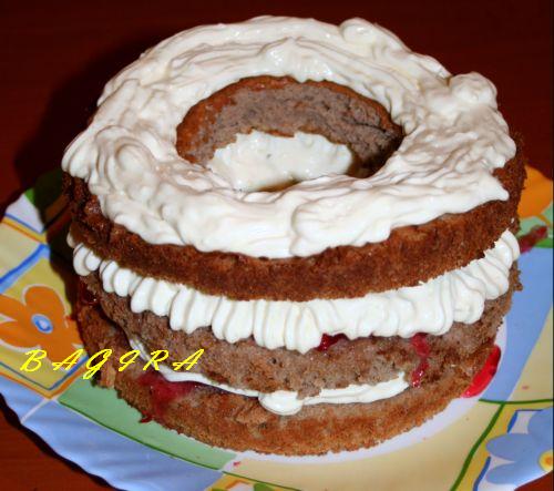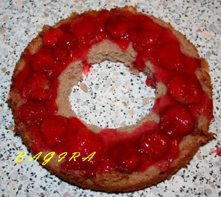 Вначале хорошо взбить яйца с сахаром, потом добавляем остальное и хорошо взбиваем. Испечь три коржа. Форма диаметр 20 см. В коржах стаканом вырезать дырочки. На коржи выложить клубнику и залить желе