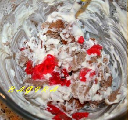 Остатки вырезанного бисквита перемешиваем с остатками крема . Я ещё накидала кусочки желе, которые у меня стекли с бисквита